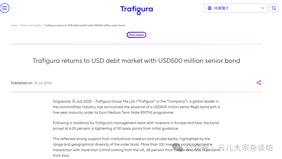 2025年7月15日 · 新加坡 Trafigura集团宣布成功发行5亿美元五年期高级RegS债券,票息6.25%,较初步指引收窄50个基点,获得来自英国、瑞士、亚洲100多家机构投资者的踊跃认购。此次发行不仅刷新了公司多元融资的节奏,也折射出市场对其多元化商业模式和稳健资产负债表的强烈认可。