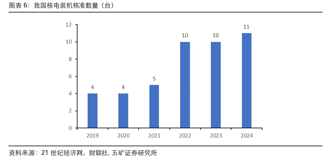 我国核准装机机组逐年增加,核电装机持续加速。截至2023年底,在建核电机组26台,总装机容量3030万千瓦,均保持世界第一。2019 年我国重启核电机组核准,2019-2024 年相继核准4/4/5/10/10 /11台核电机组。