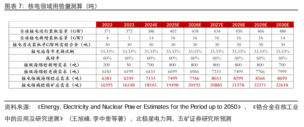 5、核电领域锆需求稳步增长 核电进入高景气度时代,全球核电领域耗锆量稳步增长。根据前文核电装机需求预测和《锆材在核电站的应用及前景》,核电首次装机单GW所需合金约30吨,核电站每年更换比例约三分之一,从海绵锆到锆合金成材率约50%~70%,我们测算到2025/2030 年全球核电领域核级海绵锆的需求量将达到0.75/0.87万吨,对应2022-2030 年CAGR 为4.0%。