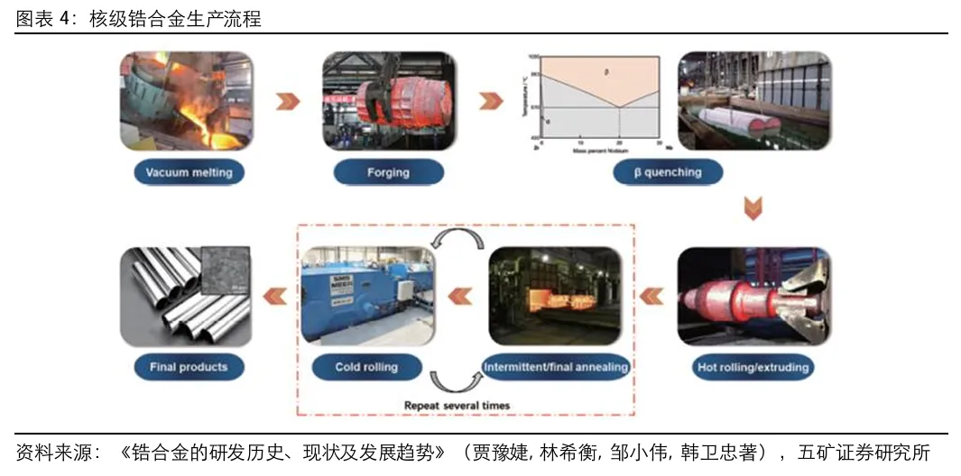 锆合金材料加工难度大,成材率较低。核用锆合金管件的加工流程包括锆合金铸锭的熔炼、铸锭锻造、β相区淬火、热轧、反复的冷轧及退火等,加工工序多,原料成材率较低。美国的华昌、西屋电气, 法国的法玛通等公司在锆合金生产领域处于世界领先水平,2020年我国企业国核锆业在消化吸收美国西屋公司Zirlo合金生产技术之后,建立了完整自主化的锆材加工生产线,实现了锆合金铸锭大规模国产化的突破。
