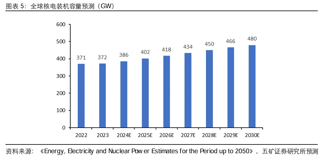 4、全球核电开启高景气周期 海外核电迎来重启浪潮,全球核电行业开启高景气周期。全球双碳减排背景下,核能作为一种低碳的清洁能源,相比光伏、风能、氢能 等其他可再生能源,兼具高密度、清洁、低碳、长期稳定运行等优势,被越来越多的国家重视。据IAEA数据,全球2023年核电装机容量为3.72亿千瓦,核能发电量为2.598万亿千瓦时,占全球总发电量的9.2%。目前全球各个国家和地区相继调整核电政策,加快核电站建设布局。根据各国政府官网,英国政府计划2030 年前每年批准建设一座、总计八座核反应堆;波兰计划于2026年开工建设第一座核电站;德国也计划将三个核电站的使用寿命延长。2024年3月,拜登政府宣布,美国联邦政府将提供15亿美元贷款,用于重启密歇根州西南部的Palisades核电站,这将是美国历史上首次重启已关闭的核电站。2024年4月,东京电力已向柏崎刈羽核电站反应堆输送核燃料,预计将于今年10月重启开始发电。核电行业步入高景气周期,全球核电装机容量或将继续快速增长。据国际原子能机构乐观预测,到2030 年全球核电装机容量将有望达到480GW。