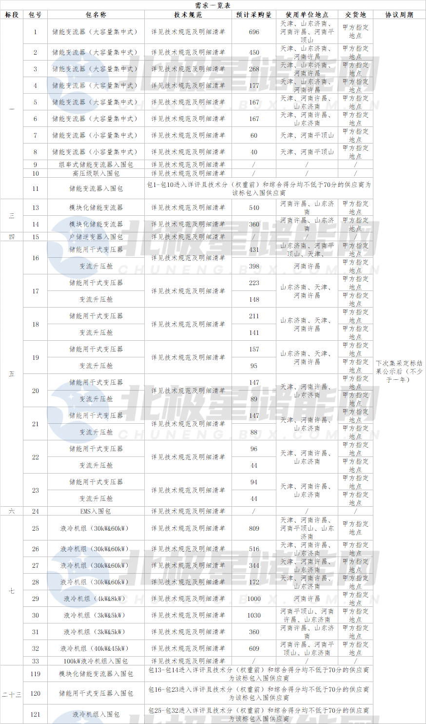 采购范围共分为8个标段、36个标包。其中,预计采购储能变流器2925套、储能用干式变压器1506套、变流升压舱1047套、液冷机组4840套。使用地点覆盖天津、河南、山东。此外,还有高压级联储能变流器、户储逆变器、EMS采购未公布规模。