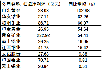 有色金属行业公司上半年净利润增幅TOP10