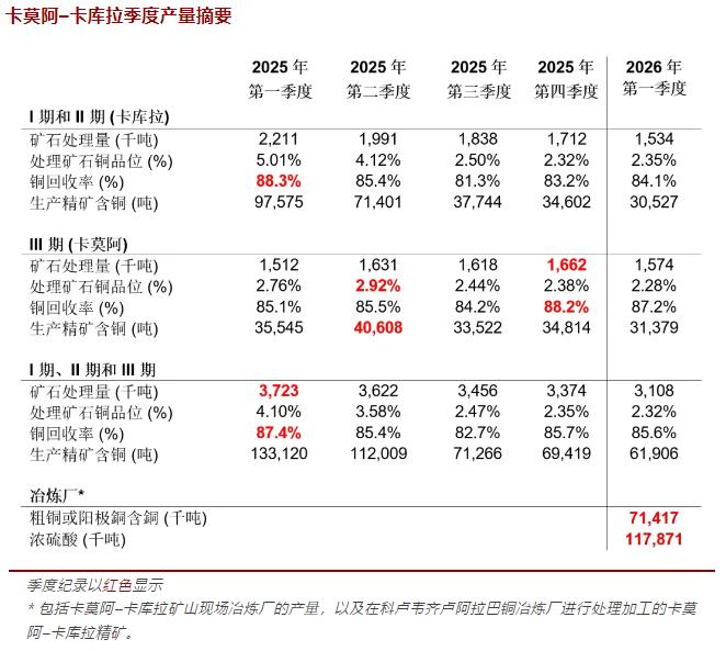 2026年第一季度,I 期、II 期和 III 期选厂共处理矿石311万吨,生产精矿含铜6.2万吨。2026年第一季度,卡莫阿–卡库拉共生产7.1万吨阳极铜和粗铜,其中包括卡莫阿–卡库拉铜冶炼厂出产的6.4万吨阳极铜,以及卢阿拉巴铜冶炼厂处理加工的7,746吨粗铜。本季度末,卡莫阿–卡库拉矿山现场约有4万吨铜库存 (包括冶炼厂库存精矿、卡莫阿–卡库拉阳极铜库存和卢阿拉巴铜冶炼厂冶炼流程中的铜) ,2025年底约有5万吨。