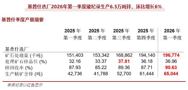 2026年第一季度,基普什选厂创下精矿产锌6.5万吨的纪录,环比增长6%,其中包括1月份破纪录生产的2.3万吨锌。