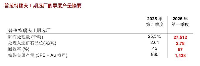 80万吨/年的 I 期选矿于2025年11月18日投产后,已累计生产约75公斤(2,400盎司)的铂、钯、铑和黄金。